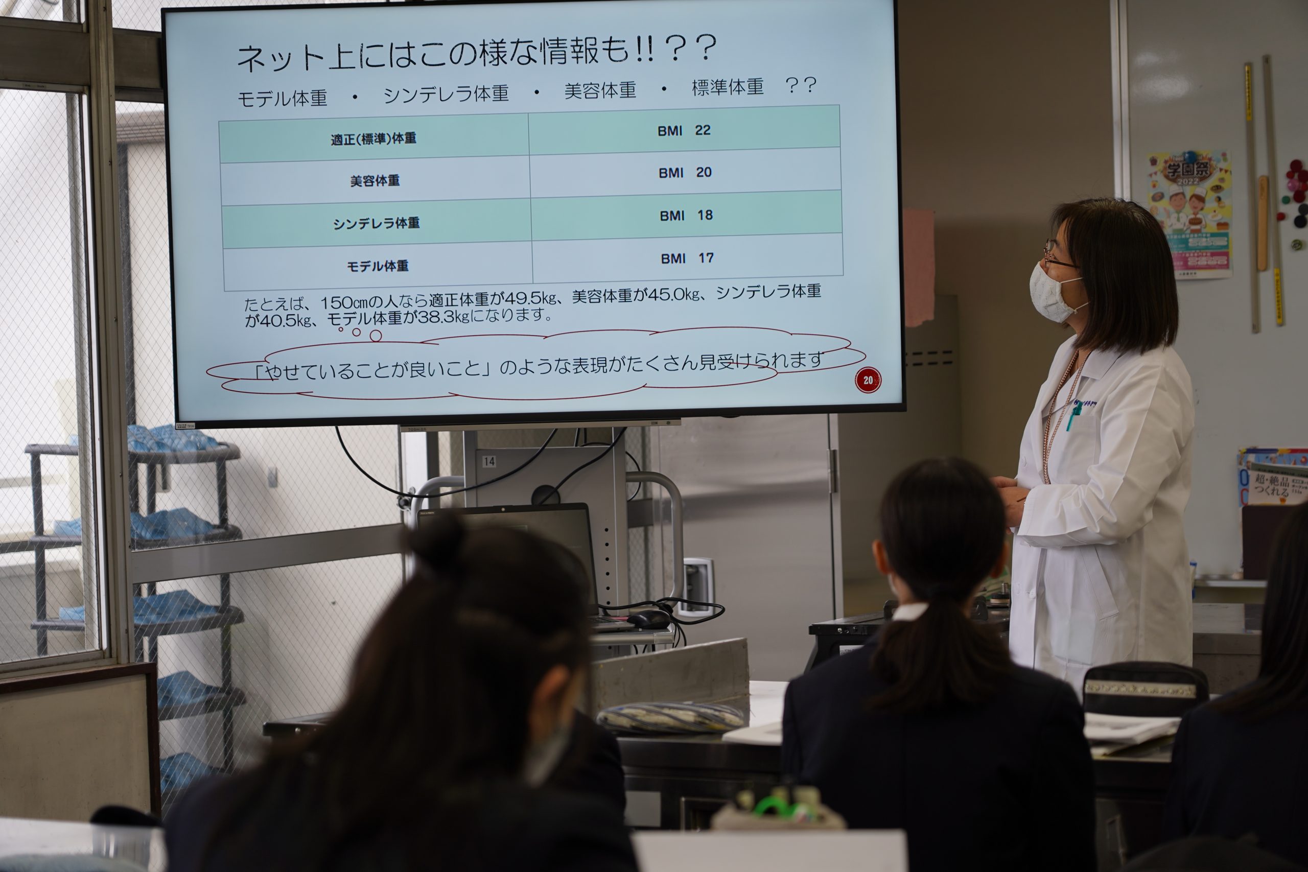 セレクト授業1年料理入門で、2月14日と2月16日に横浜栄養専門学校から先生をお招きして『栄養障害の二重負荷やせすぎも太りすぎも大問題』というタイトルで授業していただきました。やせに対する願望が高い女子高生ですが、逆にやせていることで様々な病気のリスクがあるというお話から始まりました。特に女性は、女性ホルモンの関係で骨粗鬆症になりやすいこと、やせている妊婦はあかちゃんにも影響を与えてしまうことなどを学びました。最後に自分のBMIと適正体重を算出したのですが、思っている以上に適正体重が重いことに生徒たち驚いているようでした。食べることと健康は大きく繋がっていて、そこに加えて運動習慣を持つことが重要だと先生はおっしゃいました。日ごろ、きびきび動くだけでも効果があるとのことです。生徒たちは大変興味深く先生のお話を聞いていました。