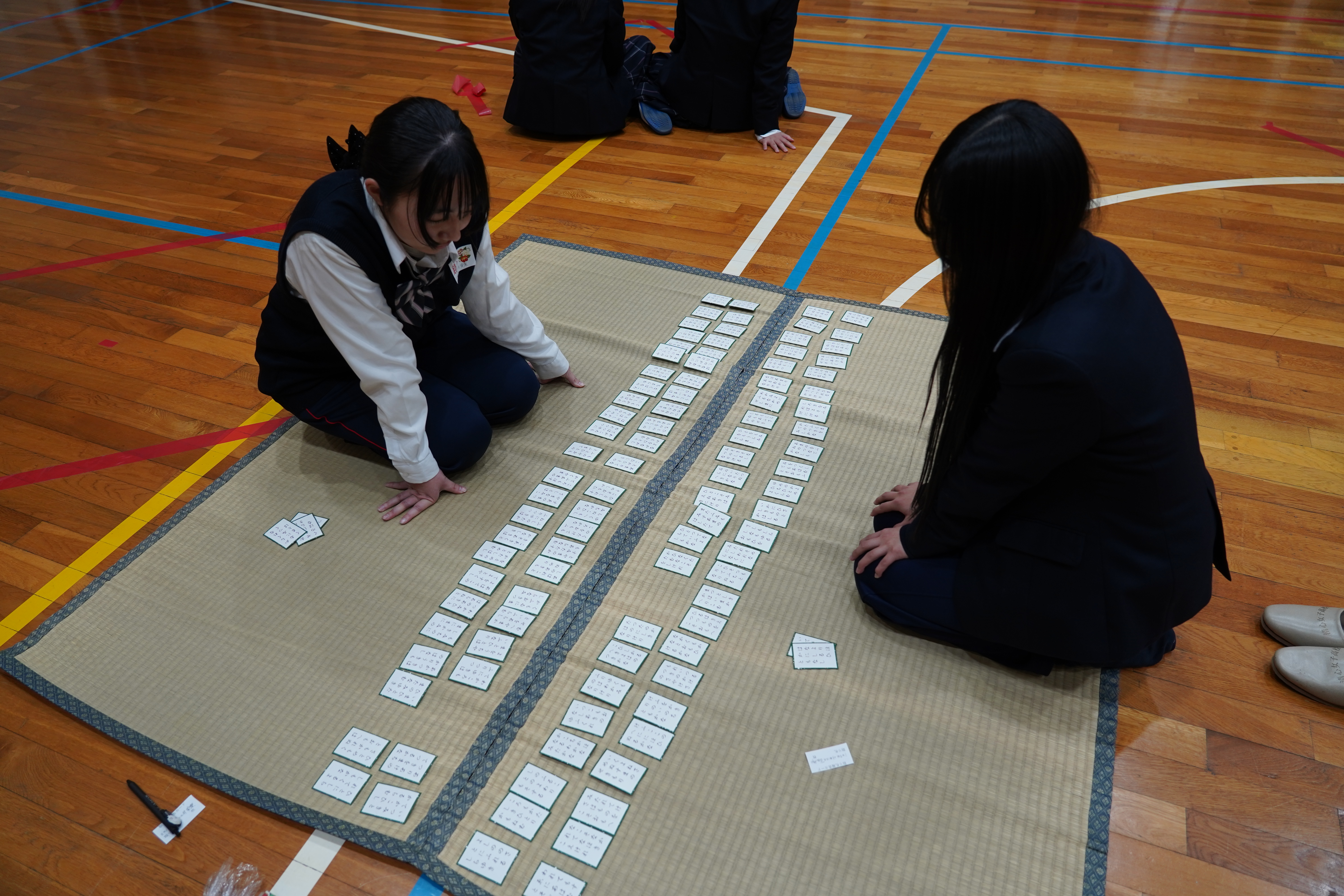 1月15日(水)、全学年全員参加の個人戦のかたちで、百人一首大会が行われました。当日は、百人一首係が進行のお手伝いをしました。また、今年度は読み手に生徒も参加しました。一人ひとり耳をすまし札に見入る真剣な姿が印象的でした。