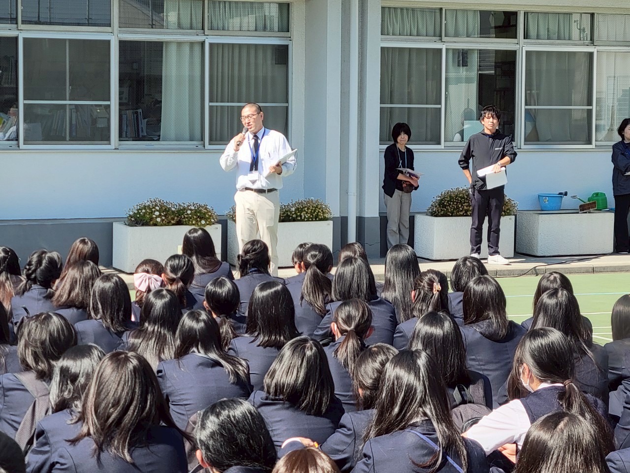 4月30日(水)、避難訓練を行いました。『おかしもち』の約束を守りながら、速やかに校庭に避難することができました。その後、避難ブロック別に分かれて、広域避難場所の岸根公園まで避難経路の確認をしました。